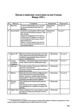 Сводка писем и заявлений, полученных на имя Сталина. Январь 1952 г. // РГАСПИ. Ф. 558. Оп. 11. Д. 880. Л. 1-8. Подлинник. Машинописный текст.