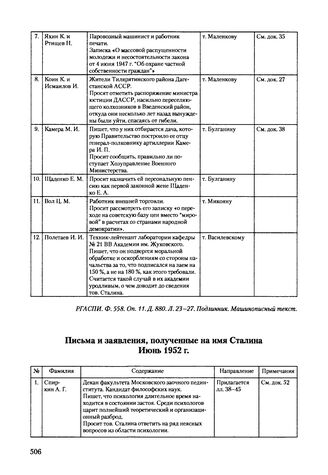 Сводка писем и заявлений, полученных на имя Сталина. Июнь 1952 г.
