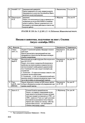 Сводка писем и заявлений, полученных на имя Сталина. Август-сентябрь 1952 г. // РГАСПИ. Ф. 558. Оп. 11. Д. 882. Л. 1-28. Подлинник. Машинописный текст.