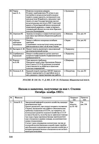 Сводка писем и заявлений, полученных на имя Сталина. Октябрь-ноябрь 1952 г.