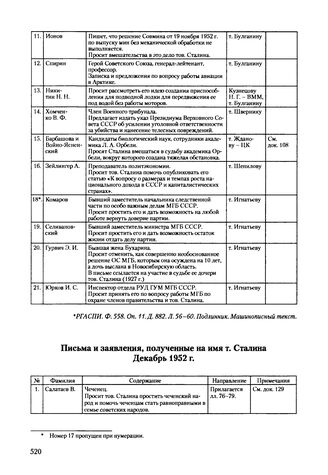 Сводка писем и заявлений, полученных на имя Сталина. Декабрь 1952 г. // РГАСПИ. Ф. 558.Оп. 11. Д. 882. Л. 68-75. Подлинник. Машинописный текст.