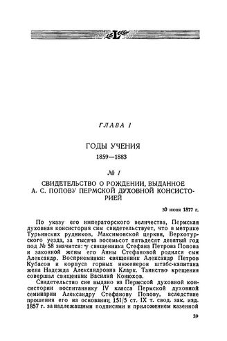Свидетельство о рождении, выданное А. С. Попову Пермской духовной консисторией. 30 июня 1877 г. // ГИАЛО, фонд 14: Петербургский университет, св. 1277, д. 19651, л. 3, копия.