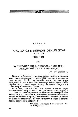 О поступлении А. С. Попова в минный офицерский класс. Кронштадт. 1883—1884 учебный год