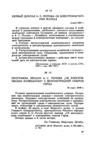 Первый доклад А. С. Попова об электромагнитных волнах. [Март] 1889 г.