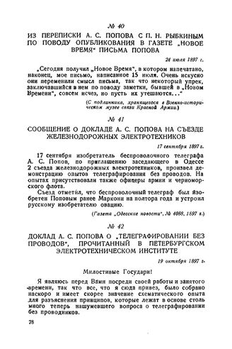 Доклад А. С. Попова о „Телеграфировании без проводов", прочитанный в Петербургском электротехническом институте. 19 октября 1897 г. // „О телеграфировании без проводов". Сообщение А. С. Попова 19 октября 1897 г. в Электротехническом институте". СПб., 1897 г.