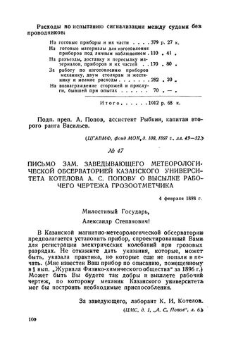 Письмо зам. заведывающего метеорологической обсерваторией Казанского университета Котелова А. С. Попову о высылке рабочего чертежа грозоотметчика. 4 февраля 1898 г. // ЦМС, д. 1, „А. С. Попов“, л. 6.