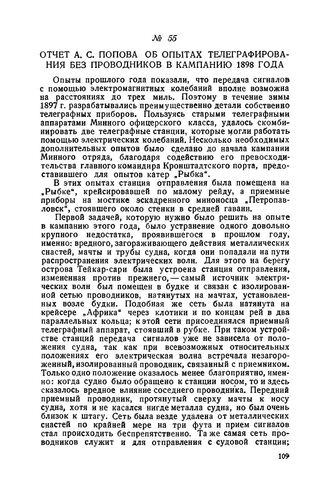 Отчет А. С. Попова об опытах телеграфирования без проводников в кам...