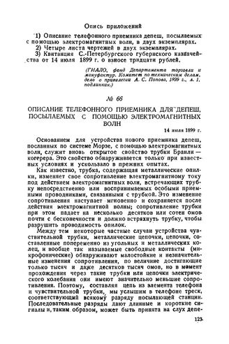 Описание телефонного приемника для депеш, посылаемых с помощью электромагнитных волн. 14 июля 1899 г.