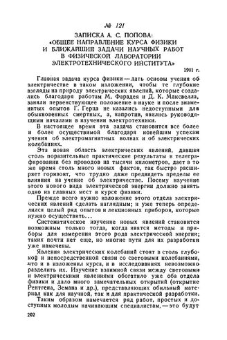 Записка А. С. Попова: «Общее направление курса физики и ближайший задач и научных работ в физической лаборатории Электротехнического института». 1901 г.