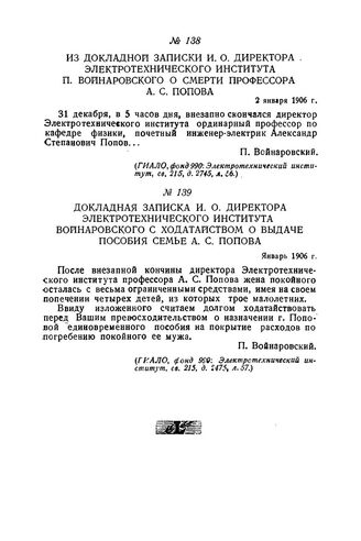 Из докладной записки и. о. директора Электротехнического института П. Войнаровского о смерти профессора А. С. Попова. 2 января 1906 г.