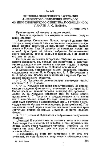Протокол экстренного заседания Физического отделения Русского физико-химического общества, посвященного памяти А. С. Попова. 24 января 1906 г.