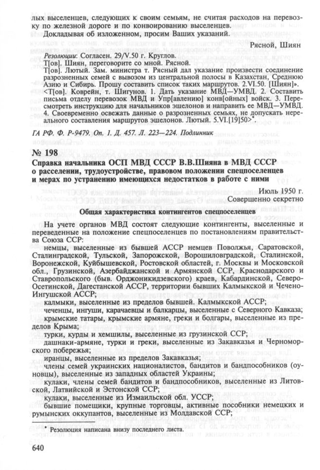 Справка начальника ОСП МВД СССР В.В.Шияна в МВД СССР о расселении, трудоустройстве, правовом положении спецпоселенцев и мерах по устранению имеющихся недостатков в работе с ними. Июль 1950 г. // ГА РФ. P-9479. Оп. 1. Д. 570. Л. 244-254. Копия.