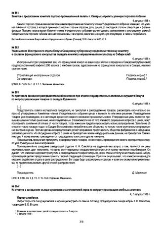 Уведомление Иностранного отдела Комуча Самарскому губернскому продовольственному комитету о согласии французского консульства передать комитету направляемый консульству из Сибири хлеб. 6 августа 1918 г. // ЦГАСО. Ф. Р-525. Оп. 1. Д. 1. Л. 1. Подлинник. Машинопись.