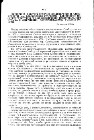 Прошение рабочих булочно-кондитерских и хлебопекарен гор. Слободского старшему фабричному инспектору Вятской губ. об обеспечении им нормального отдыха и устранении антисанитарных условий работы. 24 января 1915 г.