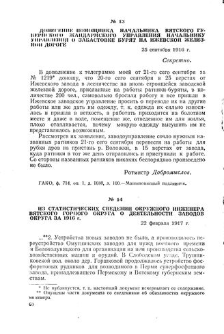 Донесение помощника начальника Вятского губернского жандармского управления начальнику управления о забастовке бурят на Ижевской железной дороге. 25 сентября 1916 г.