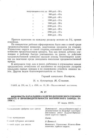Ведомость начальника Камско-Воткинского горного округа о производительности Воткинского завода за 1916 г. 17 марта 1917 г. // ГАКО, ф. 574, оп. 2, д. 4550, л. 21. Машинописный подлинник.