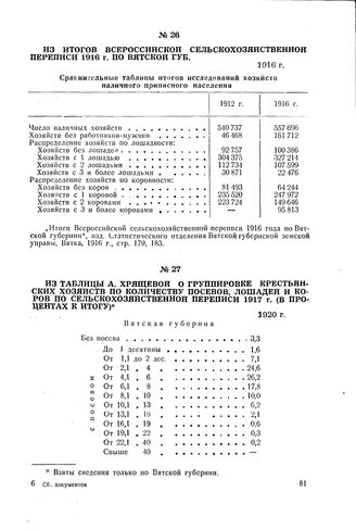 Из итогов Всероссийской сельскохозяйственной переписи 1916 г. по Вятской губ. 1916 г. // «Итоги Всероссийской сельскохозяйственной переписи 1916 года по Вятской губернии», изд. Статистического отделения Вятской губернской земской управы, Вятка, 1916 г., стр. 179, 183.