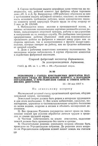 Резолюции I съезда крестьянских депутатов Малмыжского уезда по земельному вопросу, о народном образовании, о Крестьянском союзе и Совете крестьянских депутатов. 25-30 мая 1917 г.