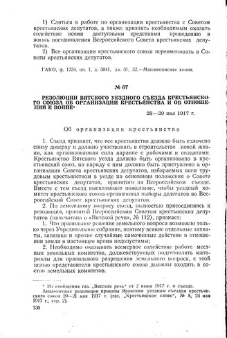 Резолюции Вятского уездного съезда Крестьянского союза об организации крестьянства и об отношении к войне. 28-29 мая 1917 г. // Газ. «Вятская речь», № 115, 2 июня 1917 г., стр. 4.