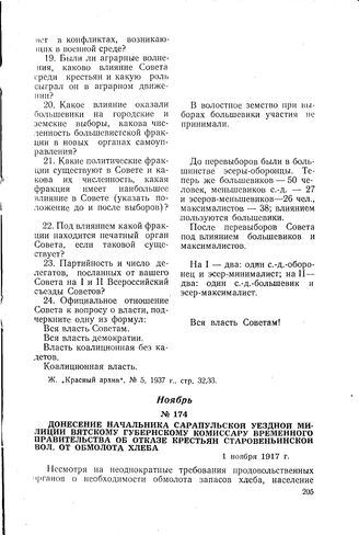 Донесение начальника Сарапульской уездной милиции вятскому губернскому комиссару Временного правительства об отказе крестьян Старовеньинской вол. от обмолота хлеба. 1 ноября 1917 г. // ГАКО, ф. 582, оп. 194, д. 5, лл. 84, 85. Машинописный подлинник.