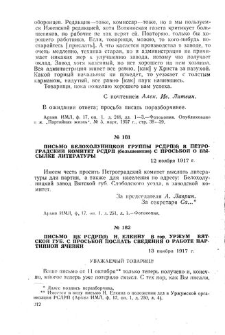 Письмо Белохолуницкой группы РСДРП(б) в Петроградский комитет РСДРП (большевиков) с просьбой о высылке литературы. 12 ноября 1917 г. // Архив ИМЛ, ф. 17, оп. 1, д. 251, л. 1. Фотокопия.