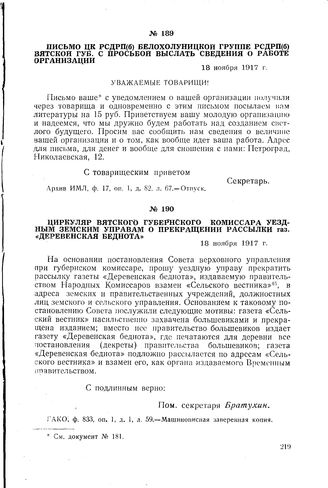 Письмо ЦК РСДРП(б) Белохолуницкой группе РСДРП(б) Вятской губ. с просьбой выслать сведения о работе организации. 18 ноября 1917 г. // Архив ИМЛ, ф. 17, оп. 1, д. 82, л. 67. Отпуск.