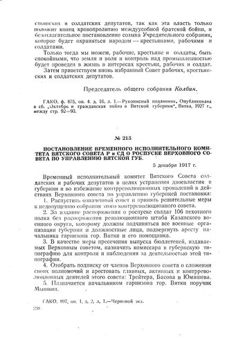 Постановление временного исполнительного комитета Вятского совета Р и СД о роспуске Верховного совета по управлению Вятской губ. 5 декабря 1917 г.