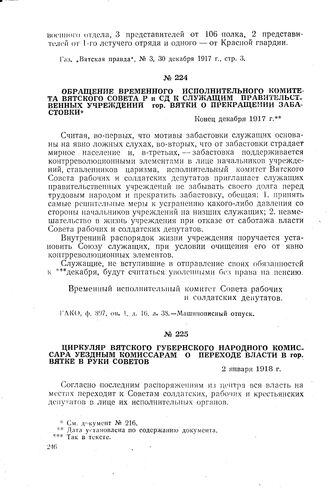 Обращение временного исполнительного комитета Вятского Совета Р и СД к служащим правительственных учреждений гор. Вятки о прекращении забастовки. Конец декабря 1917 г. // ГАКО, ф. 897, оп. 1, д. 16, л. 38. Машинописный отпуск.