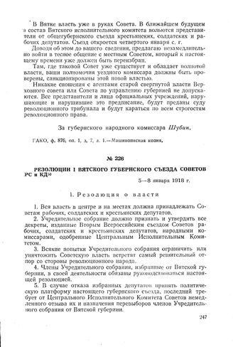 Резолюции I Вятского губернского съезда Советов PC и КД. 5-8 января 1918 г.