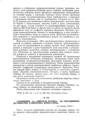 Сообщение газ. «Вятская правда» об упразднении должностей губернских комиссаров. 13 января 1918 г. // Газ. «Вятская правда», № 7, 13 января 1918 г., стр. 4.