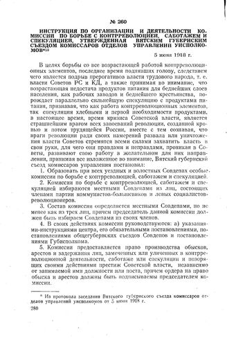 Инструкция по организации и деятельности комиссии по борьбе с контрреволюцией, саботажем и спекуляцией, утвержденная Вятским губернским съездом комиссаров отделов управлений уисполкомов. 5 июня 1918 г.