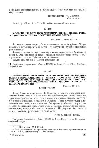 Сообщение Вятского чрезвычайного военно-революционного штаба о мятеже левых эсеров. Не ранее 7 июля 1918 г. // Партархив Кировского обкома КПСС, ф. 1, оп. 19, д. 153, л. 1. Типографский экз.