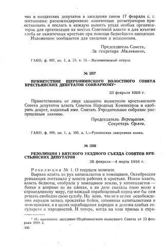 Приветствие Щербининского волостного Совета крестьянских депутатов Совнаркому. 23 февраля 1918 г.