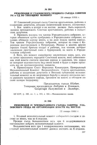 Резолюция IV Глазовского уездного съезда Советов РК и СД по текущему моменту. 20 января 1918 г. // ЦГАОР, ф. 393, оп. 3, д. 113, л. 151. Машинописная копия.