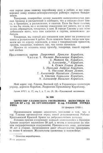 Циркуляр Глазовского уисполкома волостным Советам КР и СД об организации в гор. Глазове отряда РККА. 14 февраля 1918 г. // ГАКО, ф. 1635, оп. 2, д. 18, л. 6. Машинописный подлинник.
