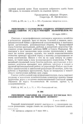 Резолюция V Глазовского уездного чрезвычайного съезда Советов PC и КД о текущем политическом моменте. 22 марта 1918 г.