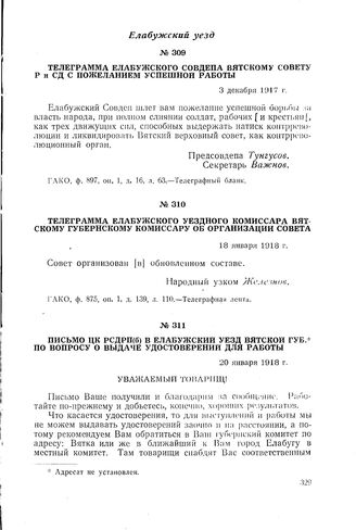 Телеграмма Елабужского уездного комиссара вятскому губернскому комиссару об организации Совета. 18 января 1918 г.