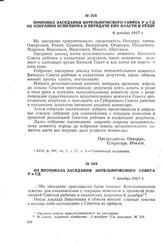 Из протокола заседания Котельнического Совета Р и СД. 7 декабря 1917 г. // ГАКО, ф. 881, оп. 1, д. 12, л. 5. Рукописный подлинник.