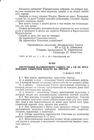 Инструкция Малмыжского Совета РК и СД об организации Советской власти на местах. 4 февраля 1918 г.