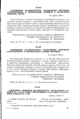 Сообщение Малмыжского уисполкома Вятскому губисполкому о ликвидации в уезде милиции. 13 апреля 1918 г.