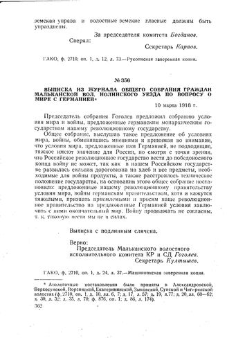 Выписка из журнала общего собрания граждан Мальканской вол. Нолинского уезда по вопросу о мире с Германией. 10 марта 1918 г. // ГАКО, ф. 2710, оп. 1, д. 24, л. 37. Машинописная заверенная копия.