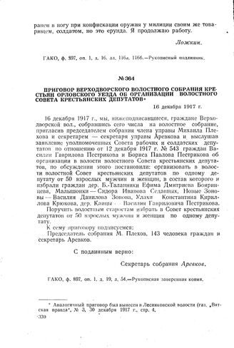 Приговор Верходворского волостного собрания крестьян Орловского уезда об организации волостного Совета крестьянских депутатов. 16 декабря 1917 г.
