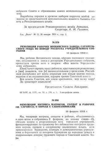 Резолюция рабочих Воткинского завода Сарапульского уезда по поводу роспуска Учредительного собрания. 14 февраля 1918 г.