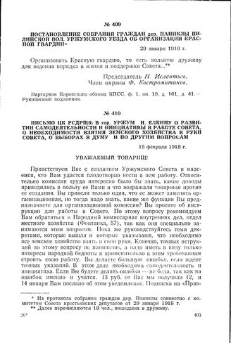 Письмо ЦК РСДРП(б) в гор. Уржум Н. Елкину о развитии самодеятельности и инициативы в работе Совета, о необходимости взятия земского хозяйства в руки Совета, о выборах в Думу и по другим вопросам. 15 февраля 1918 г. // Архив ИМЛ, ф. 17, оп. 4с-2, д. 5, ч. III, л. 94. Фотокопия.
