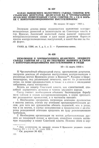 Резолюция II Чрезвычайного яранского уездного съезда Советов КР и СД по текущему моменту в связи с контрреволюционными выступлениями в уезде. 10-11 марта 1918 г.