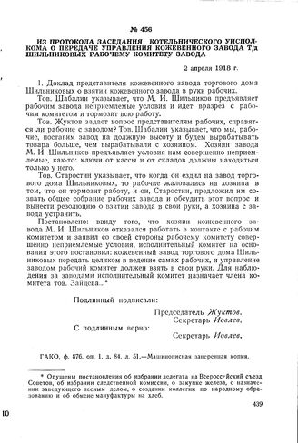 Из протокола заседания Котельнического уисполкома о передаче управления кожевенного завода Т/д Шильниковых рабочему комитету завода. 2 апреля 1918 г. // ГАКО, ф. 876, оп. 1, д. 84, л. 51. Машинописная заверенная копия.