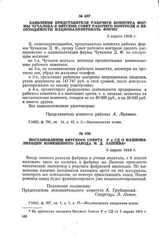 Заявление представителя рабочего комитета фирмы Чучалова в Вятский Совет рабочего контроля о необходимости национализировать фирму. 2 апреля 1918 г. // ГАКО, ф. 791, оп. 14, д. 43, л. 2. Машинописная копия.