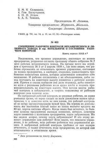 Сообщение рабочего контроля механического и литейного завода в гор....