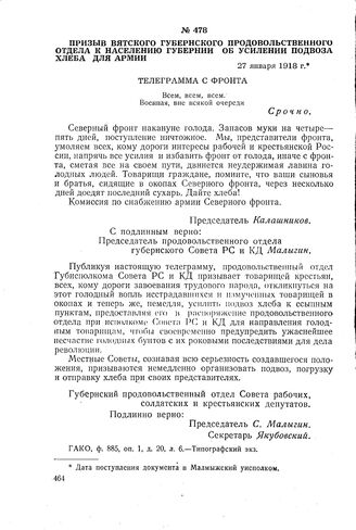 Призыв Вятского губернского продовольственного отдела к населению губернии об усилении подвоза хлеба для армии. 27 января 1918 г.