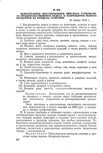 Обязательное постановление Вятского губернского продовольственного отдела о запрещении вывоза продуктов за пределы губернии. 29 января 1918 г.